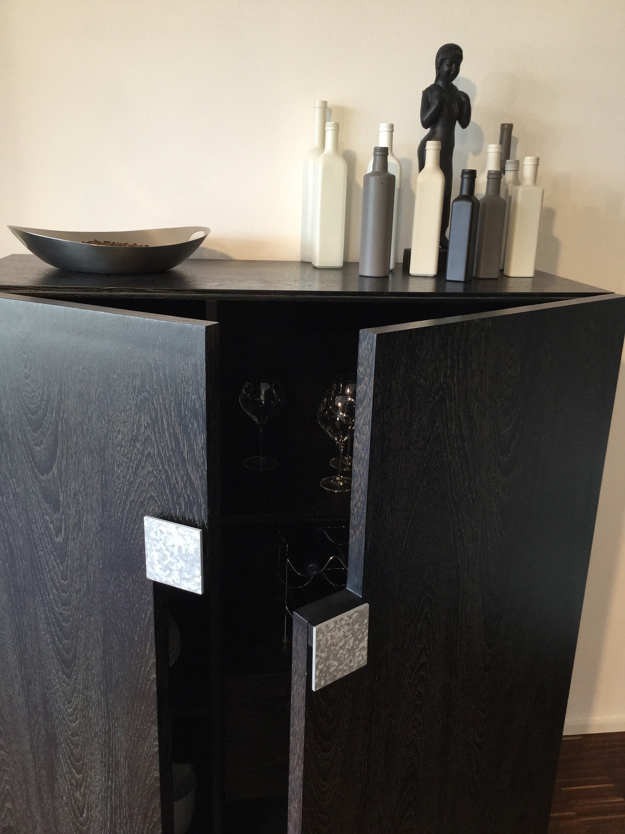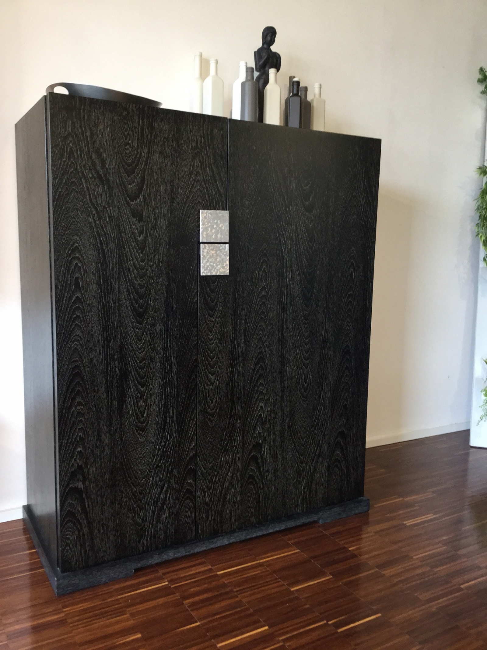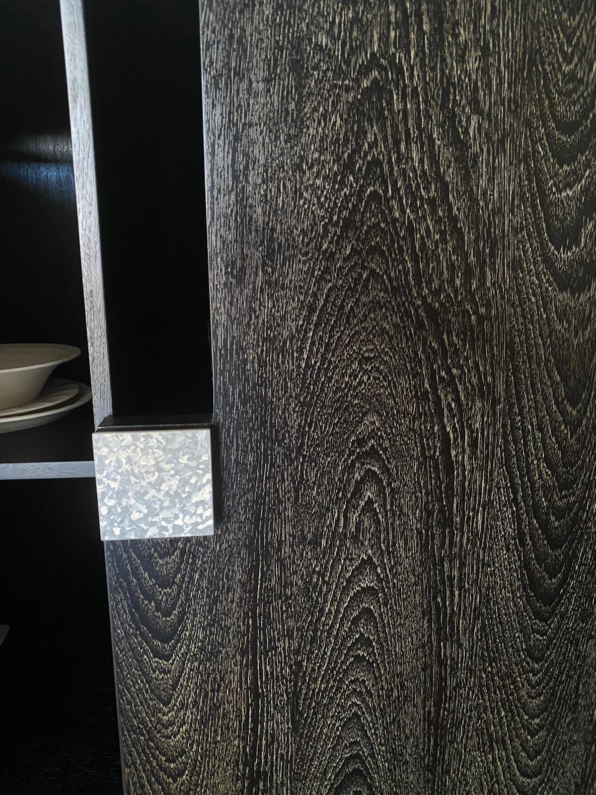 La facciata è perfettamente continua, priva di interruzioni e cornici, con un’apertura centrale enfatizzata dalle due maniglie in metallo decorativo foglia argento: piccoli gioielli applicati, in una finitura chiara e leggermente iridescente, caratterizzata da una texture frammentata che cattura la luce e crea un contrasto raffinato con il legno scuro.